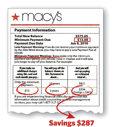 美國百貨公司Macy's在賬單詳細顯示,客戶只付最低費用與多付費的比較。新的聯邦新例亦下令信用卡公司必須如此。