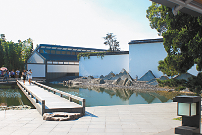 這個地方就是蘇州博物館,它的設計者是著名的建築設計大師貝聿銘。整體布局上,它巧妙地借助水面,與緊鄰的拙政園、忠王府融會貫通,成為其建築風格的延伸。儘管博物館的主色調依然是粉牆黛瓦,以此把該建築與蘇州傳統的城市機理融合在一起,但是,那些到處可見的、千篇一律的灰色小青瓦坡頂和窗框被灰色的花崗巖所取代,以追求更好的統一色彩和紋理。