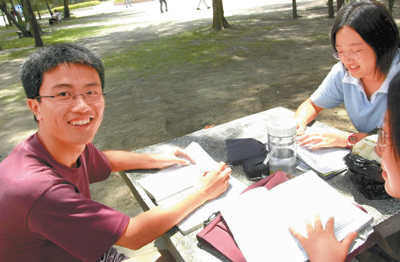 對於找異性陪讀的現象,有大學生表示,可以借此瞭解不同的思維模式,對自己的學習也有好處。圖為海南大學的幾名學生在校園內自習。