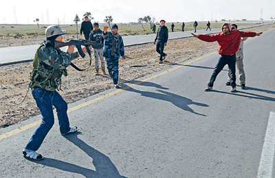 一名革命軍將槍口瞄準一名疑為卡達菲支持者時,他的同伴們警告他切勿亂開火。