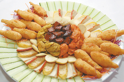 素菜一般不加佐料調色調味,以清淡為本色,青絲綠葉,間色分明,天然野味 ,香、脆、鮮並重且營養豐富,老少皆宜。圖為素齋拼素蔗蝦。