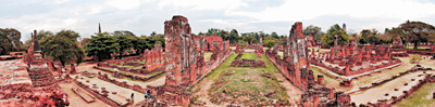 這個國祚足有四百一十七年,比我們的唐、宋及清代還要厲害的泰國史上第二強大王朝,最盛時甚至把國土開拓至緬甸和柬埔寨,成為舉足輕重的東南亞文化中心,由於商業往來頻繁,宮殿內藏有大量珍貴文獻及藝術品,可惜1776年緬甸大軍攻陷阿猶他亞時,以縱火形式徹底摧毀當地(同時也企圖以火令佛像身上的黃金熔化,方便掠奪),現今的遺其實只是整個王城的南部,也只有少數無頭佛像是真,其余“有頭有面”的佛像,都是複製品。