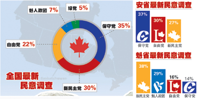 在安省,保守黨以37%支持率領先,自由黨以30%支持率排第二位,新民主黨的27%支持率僅落後自由黨3點。在魁省,新民主黨以38%支持率列前茅,取代一向領先的主權主義政黨魁人政團;排第二位的魁人政團支持29%,自由黨16%,保守黨14%。