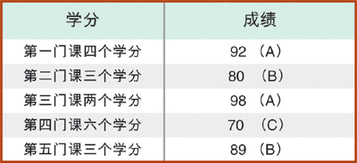 如果學生選修一門3個學分的課程,取得A的成績,因為A等成績獲4個點數,那麼就會得到3×4 = 12個點數,如果還修了一門4個學分的課程,獲得C成績,有得到4×2 = 8個點數,這樣該同學兩門課一共拿到7個學分,積累了20個點數。將合計總點數被總學分數除,就得到平均分的點數GPA為20÷7=2.86,這就是該學生的合計點數,也意味其平均分數低於B。這種方法只是一個大概或是粗略的演算法。