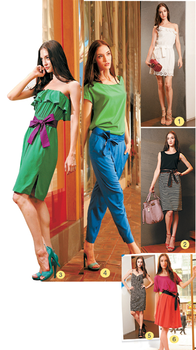 1. 白色通花束腰連衣裙、棗紅色壓紋手抓包、米白色皮革高跟鞋。 2. 黑色拼條子棉質連衣裙、綴紅邊黑色腰帶、淡紫色皮革兩用手袋、紅色皮革高跟鞋。 3. 翠綠色露肩連衣裙、酒紅色腰帶、淡綠色皮革高跟鞋。 4. 翠綠色絲質上衣、寶藍色腰帶、寶藍色絲質修腳褲、淡綠色皮革高跟鞋。 5黑白蘋果圖案吊帶裙、黑色皮革高跟鞋。 6酒紅色絲質中袖上衣、黑色腰帶、鮮紅色綴鈕扣百褶裙。