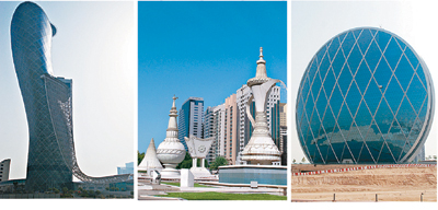 Captial Gate Tower(左)及Aldar集團總部(右)都是滿布雕塑的阿布扎比市內的矚目建築。