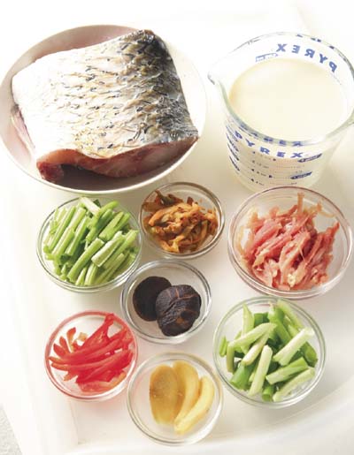 (3) 燒熱1湯匙油放薑片、肉絲、冬菇絲、炸菜絲爆香醮酒倒入豆漿煮滾