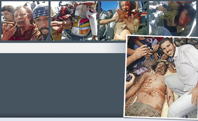 有關卡扎菲被擒殺過程的錄影顯示卡扎菲滿身鮮血,驚呆地看似乎是士兵向他揮拳痛擊並被人抓頭髮。