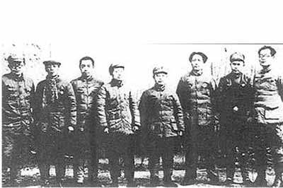 左起:張聞天、康生、周恩來、凱豐、王明、毛澤東、任弼時、張國燾1938年在延安。