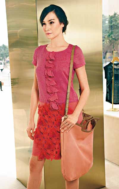 ◆用上倣蘭花花瓣裝飾的粉紅配橙色連衣裙、橙色麖皮手袋。