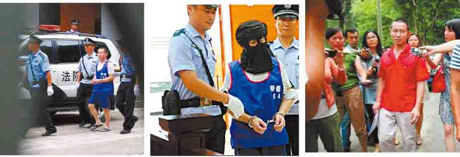 2012年5月30日,鄧明建被帶往法院(左圖),接受審判(中圖),之後,他換了身紅色T恤走出法院,與妻子華素英回家(右圖)。網上圖片