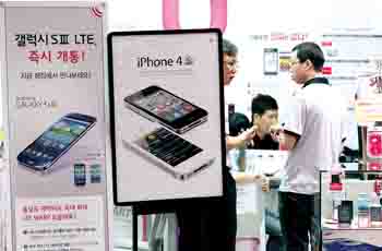 在南韓首爾一家手機店,三星Galaxy S III與蘋果iPhone 4S的廣告牌並列。美聯社