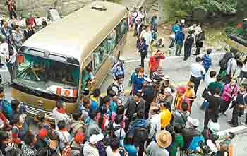 由於遊客激增,超過華山纜車運送能力,大量遊客滯留山頂。部分遊客向景區管委會要求退票,並封堵華山景區入口,造成接送遊客下山的班車無法正常運行。 網上圖片