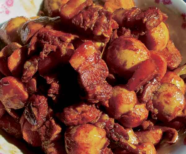 製作好的慈菇燒五花肉色澤醬紅油亮,鹹甜不膩,燒汁濃香。除了五花肉,慈菇還可以同牛肉、雞肉搭配一起烹製。