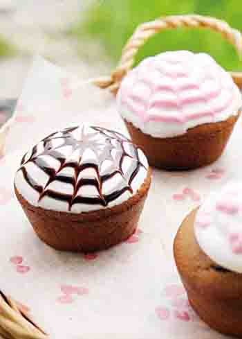 蛋糕在棉花糖糊裏蘸下,用刮刀抹去尖頭,擠上一圈圈巧克力醬,用牙籤放射狀拉出花紋即可。