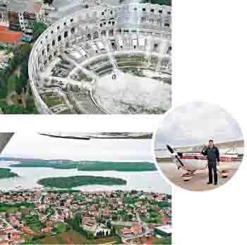近距離觀賞過鬥獸場的建築細節,我們還未滿足,決定飛到半空,再次拜會這宏偉古。我們預先訂好小型飛機的觀光行程,然後驅車到距離Pula市二十分鐘外的Medulin小型飛機場,坐上能容納四人的小型飛機,當展開為時十五分鐘的速遊Pula行程,最可觀的當然便是能居高臨下鳥瞰鬥獸場的完整外觀,飛機師還以鬥獸場當作“迴旋處”,在上空繞圈一周才作回程!由於這個位於海邊的鬥獸場,全以石灰岩逐件搭建而成,所以在陽光映照下,便會變成絢爛的金色,可惜我們飛行時運氣不好,竟然遇陰天,未能一睹最美景象,只是我們轉成留意建築的幾何結構,一樣找到觀賞的樂趣。