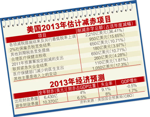 “財政懸崖”描述的正是美國政府明年將面臨的財政困局,國會可作的選擇有二,其一是明年1月1日起按原定計劃任由減稅措施結束,意味會有逾1億美國人的稅務負擔加重,加上政府實施全面削減1,000億美元總額的開支,好讓截至明年9月底的財年預算赤字,由今年的1.13萬億美元大減四成,至6,410億美元,屆時財赤佔國內生產總值(GDP)的比重,也會由7.3%降至4%;但同期經濟會陷入收縮,失業率亦會爬升至9.1%。