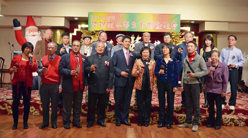 溫哥華岡州總會館日前舉行冬季生日會及聖誕聯歡會,省議員李燦明親臨致賀,強調作為省議會亞太貿易秘書,明年將繼續促進亞太貿易,爭取創造更多工職。圖為會後理事會與嘉賓合影,前排右3中國領事館僑務領事胡夢玲,右4岡州總會館理事長林錦歡,右6副領事長呂定國;後排右2副理事長湯秀順,右4中國領事館僑務領事陳炳煌,右6副理事長林發枝。岡州總會館提供