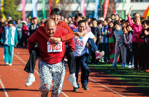 ▲北京郊區,幾對夫妻正在參加背媳婦比賽。這種趣味運動不但能增進夫妻情感,也能鍛煉身體愉悅身心,延緩衰老。新華社
